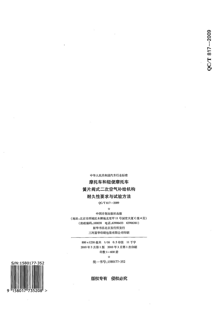 《摩托車和輕便摩托車簧片式二次空氣補(bǔ)給機(jī)構(gòu)耐久性要求與實(shí)驗(yàn)方法》QCT817-2009