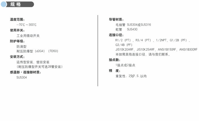 感溫元件和開關(guān)部分構(gòu)成.感溫元件內(nèi)部充滿了液體,通過液體的膨脹和收縮引起開關(guān)動(dòng)作。本產(chǎn)品可根據(jù)現(xiàn)場(chǎng)環(huán)境選擇對(duì)應(yīng)的填充液和殼體構(gòu)造。