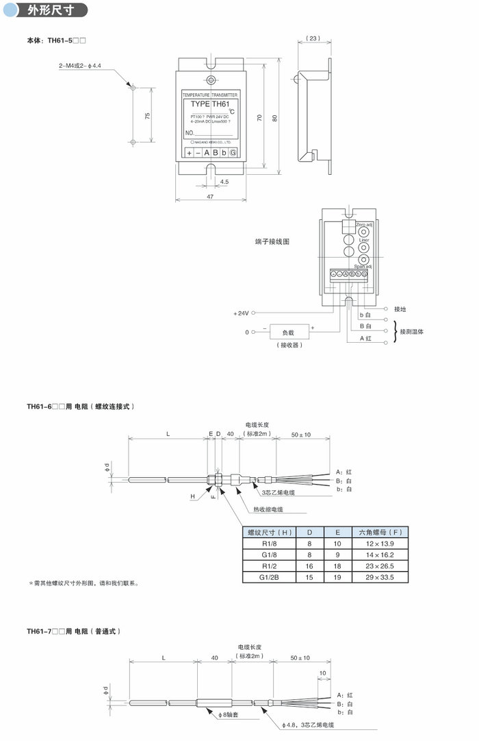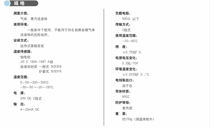 感溫部由鉑電阻構(gòu)成,且感溫部與變送部分分開。適用于測量室溫、油溫、空調(diào)等溫度。