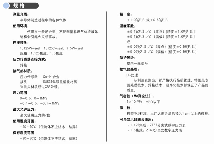 符合半導(dǎo)體行業(yè)氣體供給系統(tǒng)的集成化產(chǎn)品。此產(chǎn)品能與分離式壓力表(ZT60、ZT67)聯(lián)合使用。該產(chǎn)品有W-seal和C-seal兩種表面安裝方式可供選擇。材質(zhì)為Co-Ni合金的傳感器元件,具有卓越的可靠性和耐久性。